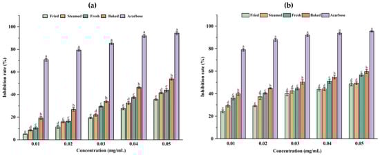 Alpha-amylase inhibitors and α-glucosidase inhibitors can delay the absorption of carbohydrates by reducing the amount of glucose in food. Alpha-amylase, a glycoside hydrolase, degrades starch into oligosaccharides or monosaccharides. The inhibitory effects of the four sweet potato polysaccharides on α-amylase are shown in Figure 7a. As the polysaccharide concentration increased, the inhibitory effect of the four polysaccharides on the activity of α-amylase increased gradually and showed a clear effect relationship. Furthermore, the inhibitory effects of baked sweet potato polysaccharides were greater than those of the fresh, steamed, and fried sweet potato groups (p < 0.05). However, all had a lower inhibitory effect than acarbose. The magnitude of the inhibitory effect of the four polysaccharides on α-amylase activity was baked > fresh > steamed > fried.