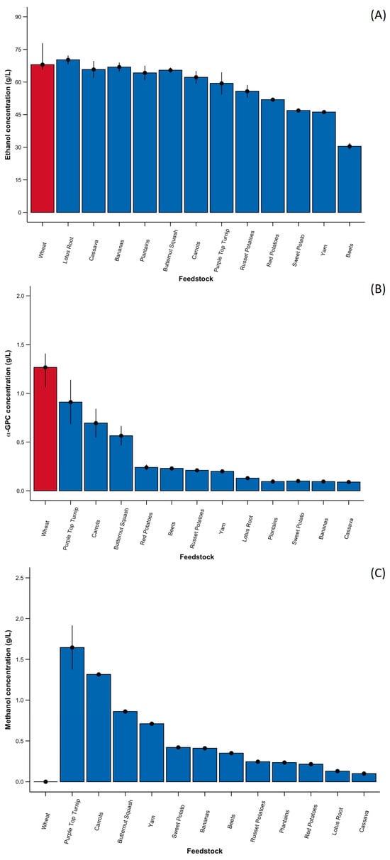 Median ethanol (A), α-GPC (B), and methanol (C) concentrations after 72 h fermentation. Wheat is highlighted in red (on the left-most side) and other substrates are labelled in blue for comparative purposes. Error bars represent the 2.5th and 97.5th percentile for each sample.