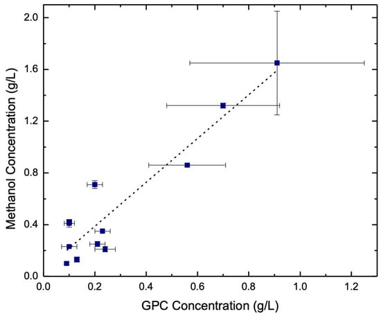 Linear regression analysis suggesting a potential relationship between the presence of methanol and the production of α-GPC in the feedstocks investigated. The blue dots represent observed data points during the experiment with standard deviation for α-GPC (horizontal) and methanol (vertical). Meanwhile, the dashed line represents the regression line, demonstrating a positive linear relationship between these two analytes.