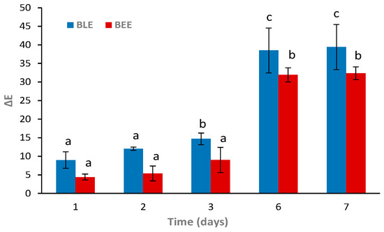 Color changes (∆E) of the BLE and BEE films during fish storage during 7 days at 4 °C. Values are given as the mean ± SD (n = 3). a–c Different letters indicate significant differences between the same film sample over time (p < 0.05).