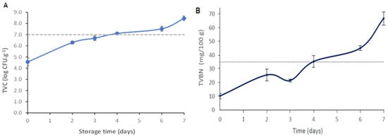 (A) Total viable count (TVC) of the hake samples stored for 7 days at 4 °C. The dashed horizontal line represents the maximum acceptable intake limit value (7 log CFU g−1. Values are the average ± SD (n = 6). (B) TVB-N levels of the hake samples during storage at 4 °C. The acceptable TVB-N limit for fish consumption (35 mg TVB-N/100 g) is represented by the dashed horizontal line. Values are the average ± SD (n = 3).