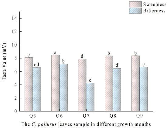 Bar chart of sweetness and bitterness values of C. paliurus leaves in different growth months. Notes: Q5–Q9 refer to the samples of the leaves of C. paliurus collected from May to September. a–e Means within the same taste value with different superscripts differ significantly (p < 0.05).