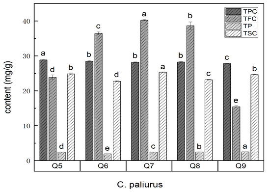 TPC, TFC, TP, and TSC from C. paliurus leaves. Notes: TPC (total phenolic content), TFC (total flavonoid content), TP (total polysaccharide content), and TSC (total saponin content). Q5–Q9 refer to the samples of the leaves of C. paliurus collected from May to September. a–e Means within the same indicator with different superscripts differ significantly (p < 0.05).