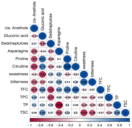 To statistically calculate the relationships between the core six metabolites and the taste intensity, Spearman’s correlation analysis coefficient was utilized in Figure 6. There was a significant correlation between the sensory characteristics (sweetness and bitterness) and the six core metabolites. The absolute value of a correlation coefficient in statistics indicates the strength of the correlation: the closer the coefficient is to 1 or −1, where −1 means completely negative correlation, 1 means completely positive correlation, and 0 means completely irrelevant, the stronger the correlation. [54]. According to Figure 6, asparagine exhibited a very strong negative correlation with the TP (−0.94), sedoheptulose showed a very strong negative correlation with the TFC (−0.8), and cis-anethole had a strong negative correlation with the TFC (−0.71). Gluconic acid demonstrated a strong positive correlation with both the TSC (0.68) and TFC (0.66), while asparagine had a strong negative correlation with the TSC (−0.67). These correlations hinted at a fascinating interaction between the metabolite profiles and the taste profiles of the C. paliurus leaves. It was reasonable to deduce that the concentrations of cis-anethole and sedoheptulose could significantly influence the bitterness intensity of the C. paliurus leaf samples, considering their direct associations with the TFC and TPC, respectively. In fact, bitterness was generally considered undesirable; still, they were important for providing the complex sensory perceptions of C. paliurus teas. Therefore, it is possible to design small molecule compounds that can competitively inhibit the binding of bitter compounds such as cis-anethole and sedoheptulose to receptors, thereby reducing the perceived bitterness. Meanwhile, asparagine had high Pearson correlation coefficients with bitterness and sweetness and negative correlation with the TSC and TP; the concentration of asparagine in the C. paliurus leaves was likely a significant determinant of the sweetness intensity. However, as one of the components of the synthetic sweetener aspartame, L-asparagine was without taste, while D-asparagine was intensely sweet. Details and mechanisms of interactions between chiral sweet molecules and sweet receptors remain to be elucidated [55]. Therefore, this study advanced our understanding of the metabolic changes and the sweetness and bitterness taste in the different growth months of the C. paliurus leaves and provided a new method for detailing the interactions between sweet molecules and sweet receptors.