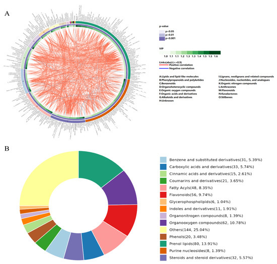 Nontargeted metabolomics analysis. (A) The circus plot of differential metabolites. Notes: Circus circle plot is arranged from the outside inwards in the following order: metabolite names, HMDB classifications of metabolites, p-values, VIP from PLS-DA analysis, and correlation lines. Arcs connecting any two points on the circle are called chords, indicating a correlation between the two points. (B) The proportion of various metabolites in C. paliurus leaf samples. Notes: Various color-coded sections denote items categorized under distinct chemical groups, with the corresponding percentages indicating the proportion of items within each chemical category. The proportion of metabolites is calculated as a fraction of the total metabolites detected. Those metabolites lacking a defined chemical classification are categorized as “others”.