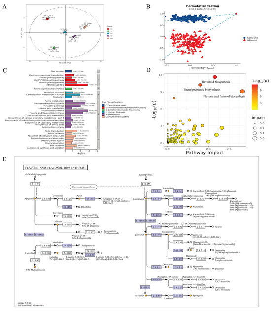 Multivariate analyses of C. paliurus leaf samples. (A) Principal component analysis (PCA) of metabolite profiles across different groups. (B) OPLS-DA permutation test plot of the comparison groups. (C) The bar chart of significant KEGG enrichment pathways. (D) The diagram of pathway impact. (E) The flavone and flavanol biosynthesis pathways.