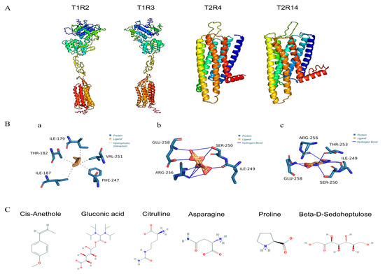Homologous modeling and screening process of molecular docking. (A) Sweet receptors (T1R1/TIR3) and bitter receptors (T2R4/T2R14). (B) Interaction patterns of hT2R14 with cis-anethole, gluconic acid and citrulline; (a) hT2R14–cis-anethole, (b) hT2R14–gluconic acid, (c) hT2R14–citrulline. (C) Six core sweet- and bitter-related metabolites.