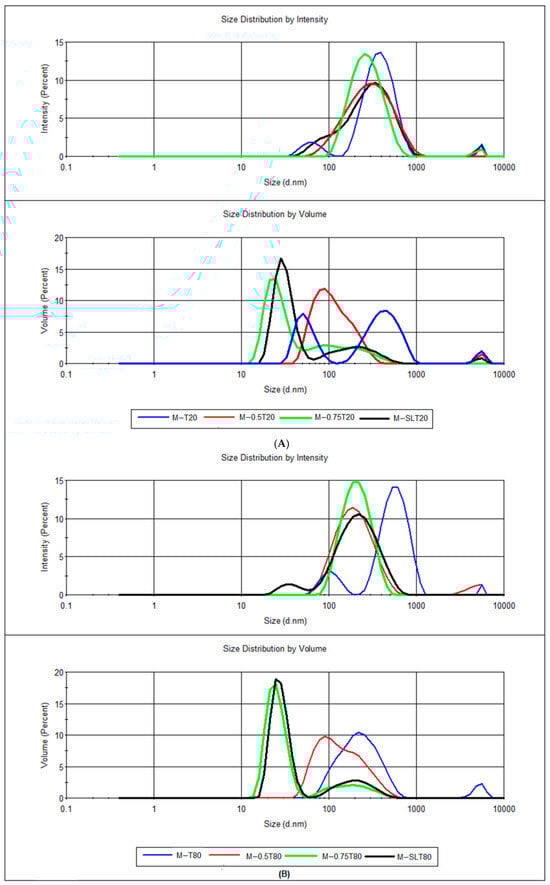 Particle size distribution (nm) of the sodium alginate-PPEO nanoemulsion expressed in intensity and volume stabilized by (A) Tween 20 and (B) Tween 80. M: microfluidized; T80: Tween 80; T20: Tween 20; 0.5: 0.5: 0.5% (w/w) sunflower oil; 0.75: 0.75% (w/w) sunflower oil; SL: soy lecithin.
