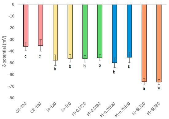 The nanoemulsion formulated with lecithin exhibited the lowest ζ-potential values, with M-SLT20 and M-SLT80 displaying −65.9 and −66.3 mV, respectively. These values are the result of lecithin phosphate groups and their negative charges that contribute to reducing the charge on the surface of the droplets, thereby increasing the negative ζ-potential [].