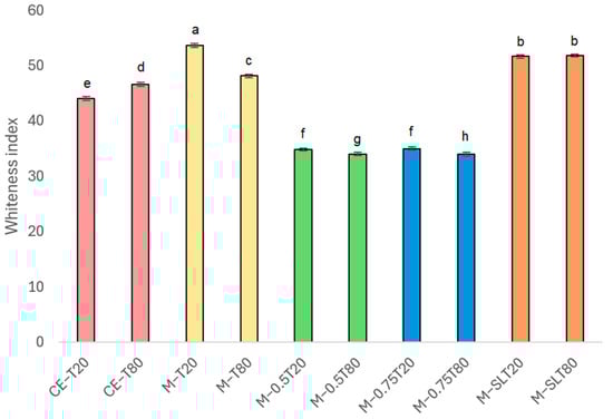 Whiteness index of coarse emulsions and nanoemulsions. Significant differences within each column are indicated by different letters (p < 0.05) by the Tukey test. CE: coarse emulsion; M: microfluidized; T80: Tween 80; T20: Tween 20; 0.5: 0.5% (w/w) sunflower oil; 0.75: 0.75% (w/w) sunflower oil; SL: soy lecithin. The data are expressed as means values ± standard deviation.
