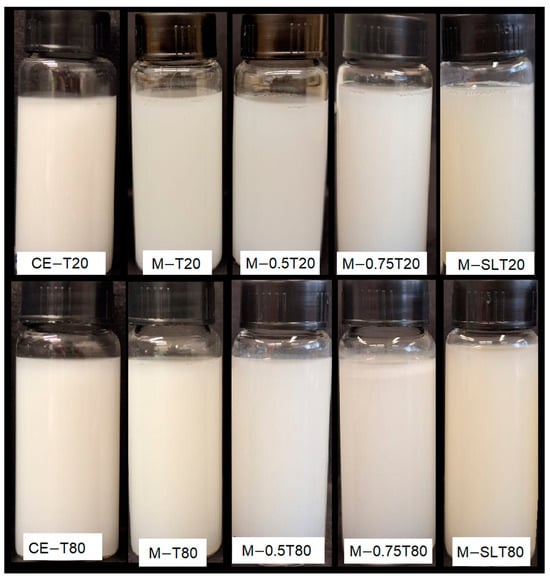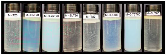 The Whiteness index (WI) is an important parameter employed to evaluate the optical properties of emulsions, reflecting the degree of light scattering by droplets within these systems, directly impacting their appearance and stability. In general, nanoemulsions are described as slightly cloudy systems, attributed to the weak scattering of light by their small droplets. As the size of the droplets increases, light scattering becomes more intense, making the emulsions appear more opaque []. Figure 3 presents the WI values of coarse and microfluidized emulsions. Despite the reduction in droplet size, all microfluidized emulsions and nanoemulsions presented an opaque visual appearance after microfluidization, and the whiteness index of some nanoemulsions was even higher than that of primary emulsions (Figure 4). Regardless of the surfactant, emulsions showed a similar behavior. Nanoemulsions with a lower oil content, M-T20, M-T80, M-SLT20, and M-SLT80, showed the highest WI values, which can be attributed to some factors associated with the composition. Firstly, the high polydispersity in the particle distribution shows a population size on the micrometer scale that may be aggregated alginate particles. Larger particles exhibit more intense light scattering compared to smaller ones, leading to amplified luminosity, opacity, and an enhanced whiteness index measurement for the nanoemulsions [,]. Additionally, the inclusion of soy lecithin, which exhibits a pronounced color, alters the overall hue of the nanoemulsion [] and contributes to an increment in the WI value.