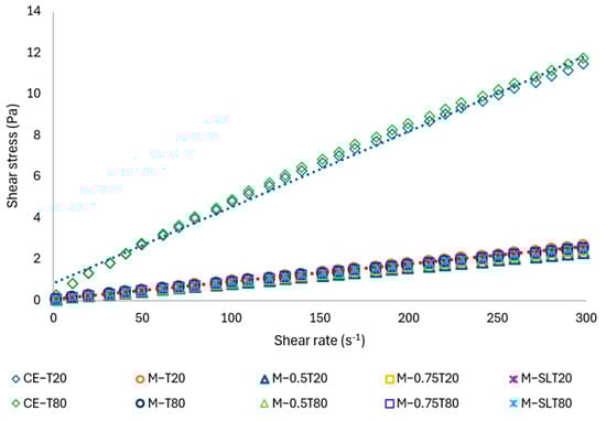 Flow curves of coarse emulsions and sodium alginate-PPEO nanoemulsions as a function of the shear rate. CE: coarse emulsion; M: microfluidized; Tween 80; T20: Tween 20; 0.5: 0.5% (w/w) sunflower oil; 0.75: 0.75% (w/w) sunflower oil; SL: soy lecithin.