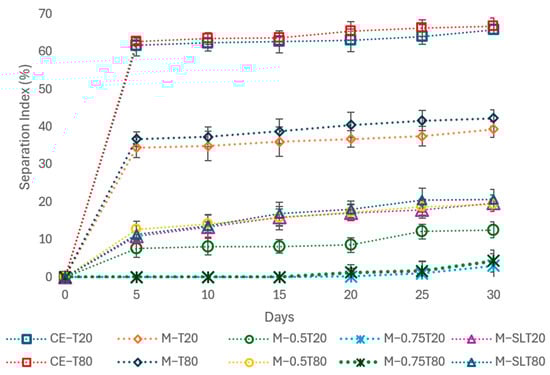 At the end of 30 days of storage, despite their formulations, the samples showed phase separation ranging from 3.02 to 62.65% (Figure 7). During the first 20 days of storage, only samples M-0.75T20 and M-0.75T80 had no phase separation. The greater stability of these samples may be related to the addition of sunflower oil combined with their reduced droplet size and PdI values.