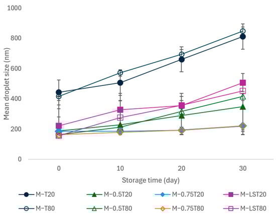 Storage stability of sodium alginate-pink pepper essential oil (PPEO) microfluidized emulsions and nanoemulsions at 25 °C. M: microfluidized; T80: Tween 80; T20: Tween 20; 0.5: 0.5% (w/w) sunflower oil; 0.75: 0.75% (w/w) sunflower oil; SL: soy lecithin. The data are expressed as means values ± standard deviation.