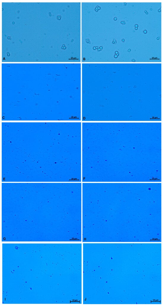 The optical microscopy images of the emulsions and nanoemulsions are shown in Figure 9. The coarse emulsions are shown in images A and B, and it is possible to see the larger droplet size and the aggregation of these droplets. Larger droplets and aggregation lead to the instability of the emulsions, which can induce creaming and phase separation. Sodium alginate-PPEO nanoemulsions can be observed in images B to J, and it is possible to observe a reduction in nanoemulsion droplet size after microfluidization. The samples M-T20 and M-T80 exhibited a larger droplet size distribution and lower pink pepper essential oil retention, and their micrographs (C and D) evidence a higher occurrence of aggregates. The limited accuracy of the images obtained is due to the tiny droplets since accurate observation using optical microscopy techniques diminishes notably when their size falls below 500 nanometers [].