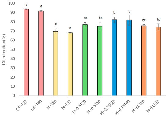 Oil retention of coarse emulsions (CE) and nanoemulsions (M). Significant differences within each column are indicated by different letters (p < 0.05) by the Tukey test. CE: coarse emulsion; M: microfluidized; T80: Tween 80; T20: Tween 20; 0.5: 0.5% (w/w) sunflower oil; 0.75: 0.75% (w/w) sunflower oil; SL: soy lecithin. The data are expressed as means values ± standard deviation.