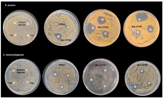 The antimicrobial activity of pure PPEO (non-encapsulated) and its nanoemulsions was investigated against gram-positive bacteria, Staphylococcus aureus, Listeria monocytogenes, and gram-negative bacteria, and Salmonella sp. and Escherichia coli. Disk diffusion test results are shown in Table 4. Sodium alginate, Tween 20, and Tween 80 showed no antimicrobial activity against the microorganisms evaluated. PPEO and two nanoemulsions, M-0.75T80 and M-0.75T20, showed antimicrobial action against the gram-positive bacteria L. monocytogenes and S. aureus, while E. coli and Salmonella sp. were not sensitive (Figure 11). Pure PPEO was previously tested by Dannenberg et al. [] against L. monocytogenes, S. aureus, E. coli, and S. Typhimurium and exhibited antimicrobial activity exclusively against the gram-positive bacteria L. monocytogenes and S. aureus with inhibition zones of 24.30 and 23.09 mm, respectively (similar to our results). The heightened susceptibility of gram-positive bacteria to PPEO is attributed to the facile penetration of nanometer-scale hydrophobic molecules through the peptidoglycan layer that constitutes the structure of gram-positive bacteria. However, the double layer of lipopolysaccharide found in gram-negative bacteria acts as a defense mechanism to the passage of antimicrobial molecules [,]. However, Salvia-Trujillo et al. [] documented the inhibition of E. coli with sodium alginate nanoemulsion loaded with lemongrass and clove oil produced in a microfluidization process. The results demonstrated that the antimicrobial effect is predominantly influenced by the active compounds of essential oils rather than their concentration [].