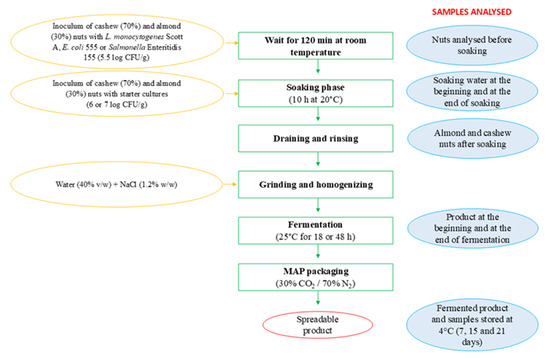 Flow sheet of fermented cashew and almond nut production during challenge test. The sampling points are also reported.
