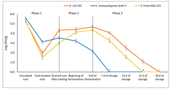 Microbial counts of inoculated pathogens during pilot-scale production optimization trial. The graph is divided into three phases: phase 1 includes nuts after treatment in a hot water bath and after the soaking phase, phase 2 comprises spreadable samples during fermentation and phase 3 includes spreadable products during storage. The presence of an asterisk indicates that S. Enteritidis was present in 25 g of sample.