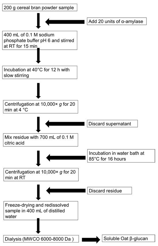 For purification, 100 g of HBOB and AOB was mixed with 200 mL of 0.1 M sodium phosphate buffer (pH 6) and then combined with 20 units of α-amylase, pre-warmed to 40 °C in a water bath. The mixture was incubated for 12 h at 40 °C with gentle stirring. This process resulted in a thick slurry that retrograded to form a solid lump and a yellow aqueous solution which was discarded. The solid lump was then blended with 500 mL of 0.1 M citric acid, and an additional 200 mL of citric acid solution was added to the slurry. The mixture was incubated for 16 h at 85 °C. After incubation, the slurry was centrifuged at 10,000× g for 20 min at RT. The separated β-glucan-rich viscous supernatant was retained for further purification. The pH of the supernatant was adjusted to 7.4 using 1 M sodium hydroxide, after which 40 mg of pancreatin (from porcine pancreas, Sigma-Aldrich, St. Louis, MO, USA) dissolved in 10 mL of 0.1 M sodium phosphate buffer (pH 6) was added. The mixture was then incubated at 40 °C for 12 h with gentle stirring. The resulting solution was freeze-dried and subsequently redissolved in 400 mL of distilled water. To reduce viscosity, the viscous solution was heated at 80 °C for 30 min before being transferred into a dialysis tubing with a molecular weight cut-off of 6000–8000 Da (Spectrum® Laboratories Inc., Compton, CA, USA). The dialysis bags were placed in a larger container containing distilled water at ten times the volume of the sample per bag and gently stirred overnight. The water in the container was replaced every 3 h for three additional times. The final samples were then assayed for β-glucan content.