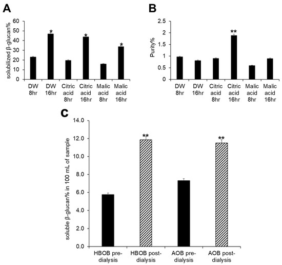 Acid hydrolysis using 0.1 M citric acid for 16 h at 85 °C produced a similar percentage of solubilized β-glucans as achieved with pure distilled water (Figure 2A). Notably, acid hydrolysis employing citric acid increased the purity of the resultant solution (Figure 2B). Therefore, acid hydrolysis with 0.1 M citric acid for 16 h at 85 °C was employed to solubilize β-glucan from HBOB and AOB. This was followed by digestion using pancreatin and dialysis to purify the solubilized oat β-glucan extract (Figure 1). Dialysis resulted in increased purity, as indicated by the doubling of soluble β-glucans post-dialysis (Figure 2C).