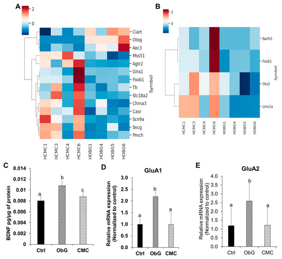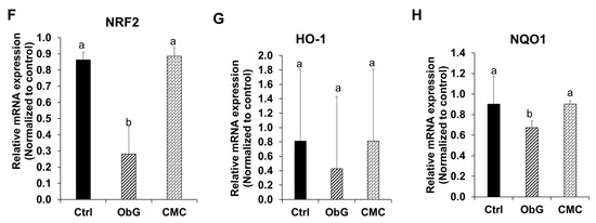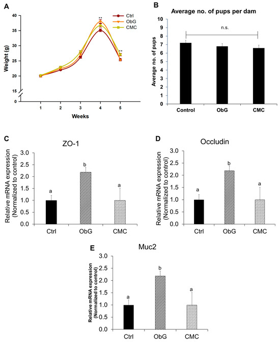 Clinical parameters observed in dams during gestation and birth (n = 6). (A) Trend in average body weight of dams 1 week before, during, and 1 week after gestation. (B) Average number of pups per dam in the three test groups. RT qPCR analysis of markers of intestinal barrier function: (C) ZO-1, (D) Occludin, and (E) Muc-2. Statistical significance was determined using ANOVA among the three test groups (p < 0.05). RT-qPCR data are presented as mean ± SEM, with different letters indicating significant differences in the ObG and CMC groups compared to the Control group, as determined using a t-test (p < 0.05).