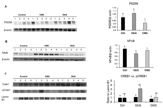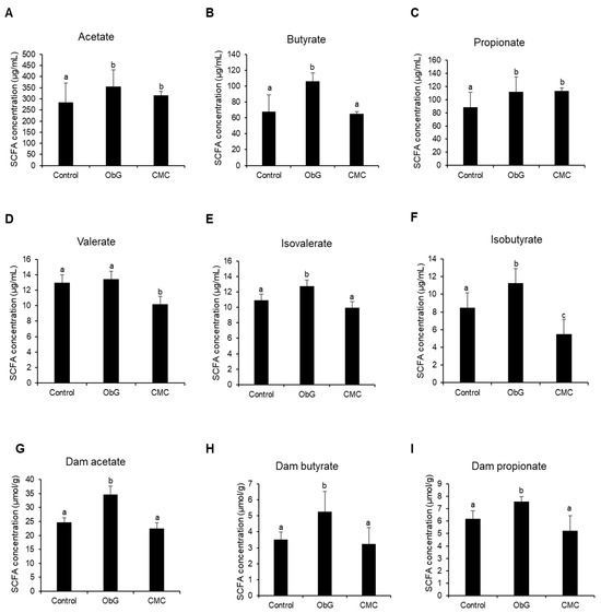 Alterations in cecal SCFA concentrations in 4-week-old pups (n = 6) (A–F) compared to dams (n = 4) (G–I) across various treatment groups. Data are presented as mean ± SEM. Different letters indicate significant differences between the ObG and CMC groups compared to the Control, as determined using a t-test (p < 0.05).