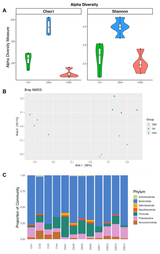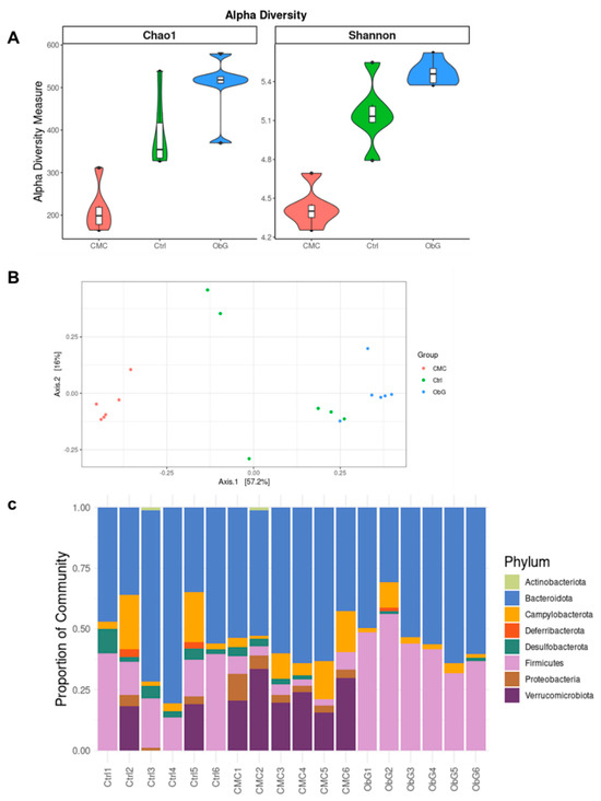Effect of ObG supplementation on the gut microbiome profile of 4-week-old pups (n = 6). (A) Shannon diversity index of microbial alpha-diversity based on relative abundance at the genus level compared to the CMC and Control groups. (B) Comparison of relative abundance at the family level between the CMC and Control groups. (C) Principal coordinate analysis (PCoA) of genus-level profiling data in the three groups (ObG, CMC, Control), based on Bray-Curtis dissimilarity.