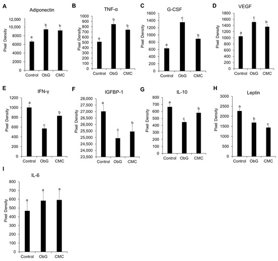 Serum aliquots (20 µL) from each group were pooled to create two replicates of 100 µL, which were used for the cytokine array analysis. The serum was analyzed using a Proteome Profiler Mouse XL cytokine array (R&D Systems, Cat # ARY028) according to the manufacturer’s instructions. Immunoblot images were captured and visualized using the ChemiDoc MP imaging system (Bio-Rad, Hercules, CA, USA). Spot densities were quantified using Quick Spots image analysis software v25.6.0.3 from R&D Systems®. Cytokine spot intensities were measured with consistent area sizes and subtracted from the background intensity of adjacent areas. Data are presented as the mean of t arrays per analyte ± SEM.