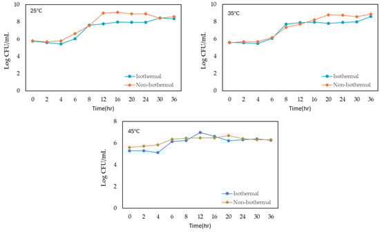 The growth of S. enteritidis in liquid whole egg was monitored under both isothermal and non-isothermal conditions across a range of temperatures from 5 °C to 45 °C, with incubation times extending up to 36–120 h (Figure 1). The initial bacterial concentration was approximately 5 log CFU/mL in all conditions.