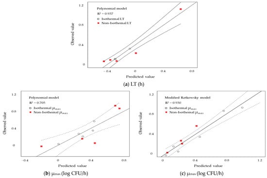 As shown in Figure 2, The observed LT values (a) closely matched the predicted values, demonstrating a relatively high goodness-of-fit (R2 = 0.937) for the predictive models. The R2 values for the observed μmax from the polynomial and Modified Ratkowsky models were 0.705 and 0.930, respectively, indicating that the Modified Ratkowsky model is more appropriate. Comparing the predicted values with the observed values suggested that linear regression could provide predictions closer to the experimental data.