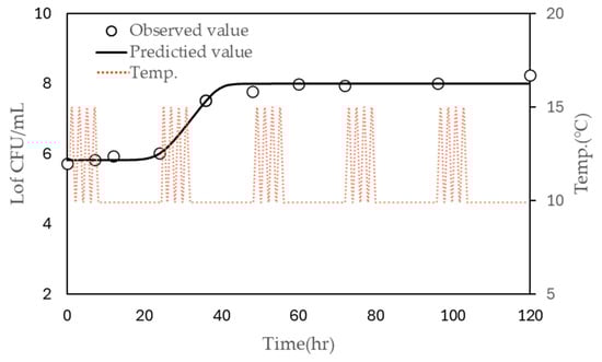 The models were further validated using growth data obtained from inoculated liquid whole egg stored under non-isothermal conditions, where the temperature fluctuated between 10 °C and 15 °C over a 24-h period with four cycles of temperature change (Figure 3). The observed LT and μmax were 31.776 h and 0.076, respectively, while the predicted LT was 34.498 h. The predicted µmax values were 0.163 using the polynomial model and 0.142 using the modified Ratkowsky model. These results indicate that the predictions of the model are reasonably close to the observed values and demonstrate the model’s reliability for predicting microbial growth under fluctuating temperature conditions.