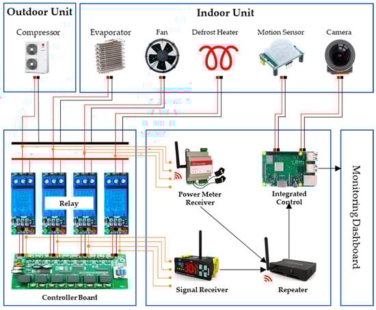 Through our study, we observed how foodborne pathogens like Salmonella grow under non-isothermal conditions and confirmed the importance of strict temperature control in maintaining food quality and safety. In South Korea, HACCP systems are rigorously applied across food and livestock manufacturing facilities, with refrigerated storage processes designated as CCP that are regularly monitored. However, the limitations of manual temperature monitoring can lead to delayed responses to temperature deviations, potentially compromising product safety and quality. To address this, real-time monitoring and precise control are essential, and Internet of Things (IoT) technology makes this possible. IoT-integrated solutions enable continuous tracking and management across the entire process, significantly improving operational efficiency and the ability to maintain safety standards through rapid problem detection and resolution [27,28]. We have developed an integrated sensor system that monitors factors such as door openings and equipment malfunctions, which can lead to temperature deviations, in real-time (Table 3). This system is equipped with temperature sensors, power detection sensors, door opening sensors, and motion sensors, enabling comprehensive environmental monitoring and immediate detection and response to potential issues (Figure 4). As abnormal temperature fluctuations during refrigeration can lead to the proliferation of foodborne pathogens, the system utilizes IoT technology to continuously monitor temperature changes in real time and quickly resolve any issues, ensuring the quality and safety of stored products. This integrated approach significantly enhances the safety and efficiency of food manufacturing processes and allows for proactive management of potential risks.