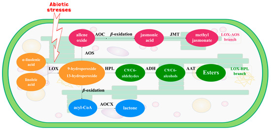The LOX pathway of α-linolenic acid and linoleic acid located in chloroplasts of tea leaf. LOX: lipoxygenase; AOS: allene oxide synthase; AOC: allene oxide cyclase; JMT: jasmonic acid carboxyl methyltransferase; HPL: hydroperoxide lyase; ADH: alcohol dehydrogenase; AAT: alcohol acyltransferases; ACOX: acyl-CoA oxidase.