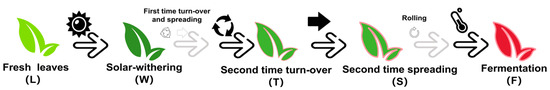 The fresh tea leaves (Camellia sinensis cv. Jinmudan) all were plucked at the tea garden of Fujian Xianliangge Tea Ltd. (Fu’an, China) on October 2022. All leaves were collected from the same branch with the standard “one bud and three leaves” approach, which is typical for the process industrially [33]. Five processing steps were selected to collect materials for volatile compounds detection and RNA sequencing, marked as fresh leaves (L), after solar withering (W), after second time turn-over (T), after second time spreading (S), after fermentation (F) (Figure 2). Tea leaves were collected and then deep frozen in liquid nitrogen, and they were maintained at −80 °C for further study.