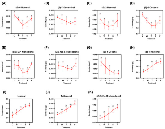 The dynamic change of fatty-acid-derived aldehyde compounds. L: fresh leaves; W: after solar withering; T: after second time turnover; S: after second time spreading; F: after fermentation. Note: Different lowercase letters (a, b, c, d, e) represent significant differences at p < 0.05. (A): (E)-6-Nonenal. (B): (Z)-7-Decen-1-al. (C): (E)-2-Decenal. (D): (Z)-2-Decenal. (E): (E,E)-2,4-Nonadienal. (F): (2E,4Z)-2,4-Decadienal. (G): (E)-4-Decenal. (H): (Z)-4-Heptenal. (I): Hexanal. (J): Tridecanal. (K): (E,E)-2,4-Undecadienal.