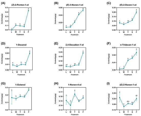 The dynamic change of fatty-acid-derived alcohol compounds. L: fresh leaves; W: after solar withering; T: after second time turnover; S: after second time spreading; F: after fermentation. Note: Different lowercase letters (a, b, c, d) represent significant differences at p < 0.05. (A): (Z)-2-Penten-1-ol. (B): (E)-3-Nonen-1-ol. (C): (E)-2-Decen-1-ol. (D): 1-Decanol. (E): 2,4-Decadien-1-ol. (F): n-Tridecan-1-ol. (G): 1-Octanol. (H): 1-Nonen-4-ol. (I): (E)-2-Nonen-1-ol.