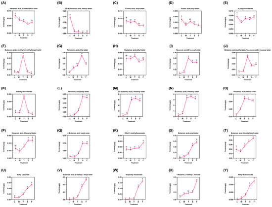The dynamic change of fatty-acid-derived ester compounds. L: fresh leaves; W: after solar withering; T: after second time turnover; S: after second time spreading; F: after fermentation. Note: Different lowercase letters (a, b, c, d) represent significant differences at p < 0.05. (A): Hexanoic acid, 1-methylethyl ester. (B): (Z)-4-Decenoic acid, methyl ester. (C): Formic acid, octyl ester. (D): Acetic acid, octyl ester. (E): n-Amyl isovalerate. (F): Butanoic acid,2-methyl-, 2-methylpropyl ester. (G): Nonanoic acid, ethyl ester. (H): Heptanoic acid, ethyl ester. (I): Hexanoic acid, 3-hexenyl ester. (J): Octanoic acid, methyl ester. (K): Isobutyl isovalerate. (L): Hexanoic acid, butyl ester. (M): (E)-butanoic acid, 3-hexenyl ester. (N): Butanoic acid, 5-hexenyl ester. (O): Hexanoic acid, methyl ester. (P): Hexanoic acid, 5-hexenyl ester. (Q): 2-Butenoic acid hexyl ester. (R): Ethyl 5-methylhexanoate. (S): Butanoic acid, octyl ester. (T): Butanoic acid, 3-methylbutyl ester. (U): Butyl caprylate. (V): Butanoic acid, 2-methyl-, hexyl ester. (W): Isopentyl hexanoate. (X): 1-Butanol, 3-methyl-, formate. (Y): Ethyl 9-decenoate.