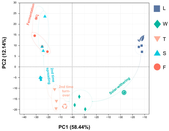 Principal Component Analysis (PCA) is a multivariate statistical technique that extracts important variables via the linear transformation of numerous variables, enabling the classification of comprehensive indicators according to predefined rules. Our study demonstrated that PCA effectively distinguished five samples, with the first principal component accounting for 58.44% and the second for 12.14%, indicating the reliability of this analytical approach. Specifically, fresh leaves (L) were positioned in the first quadrant, signifying their initial state prior to post-treatment. Withering leaves (W) and second turnover samples (T) resided in the third and fourth quadrants, respectively, which is indicative of water deficit and mechanical stress experienced during their respective treatments. The subsequent stages of spreading (S) and fermentation (F) were situated in the second quadrant. The close proximity between duplicate samples indicates the high repeatability of this analytical mode (Figure 6).