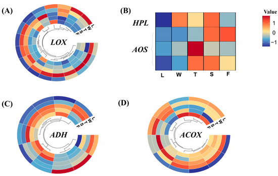 The expression of genes in fatty acid metabolism and its related branch pathway. L: fresh leaves; W: after solar withering; T: after second time turnover; S: after second time spreading; F: after fermentation. LOX: lipoxygenase; HPL: hydroperoxide lyase; ADH: alcohol dehydrogenase; ACOX: acyl-CoA oxidase.