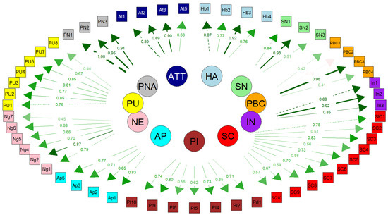 Examining the items of the developed questionnaire according to reliability and convergent validity results revealed that an acceptable result was obtained with factor loadings of >0.3. Although PBC had a relatively low-performing reliability (CR, 0.638; α = 0.622), PBC, PI, PM, SC, and NE have relatively low-performance validities. Other variables presented high-performance validity and reliability values. Three items in PI (the seventh item appeared in CFA), one item in PM, one item in AP (apathy), one item in NE (Negativity), one item in PU, two items in PNA (perceived nonautonomy), and two items in ATT (Attitudes) were removed, which impaired high or low-performance validity and reliability. Figure 1 presents the results of the confirmatory factor analysis (CFA) for the constructs used in this study. Significant relationships between the variables in the model were found as a result of the CFA. After 42 modifications were made, the model fit was improved, ensuring that the model best reflected the theoretical structure. During the model improvement process, the ‘personal management’ construct and its related items were removed, along with the PI7 item (the seventh item in the personal impact construct) during the CFA process. The modifications were made to better clarify the relationships between the latent variables and the observed variables (Figure 1).