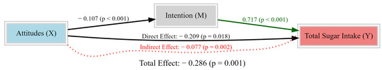 The SEM diagram shows that habits, self-control, perceived behavioral control, subjective norms, apathy, negativity, and perceived autonomy significantly predict attitude, whereas attitude affects intention and sugar intake through intention. However, attitude did not significantly affect sugar intake directly (without intention). Accordingly, evaluating the structural equation diagram and the independent mediation model together revealed that attitude, influenced by various factors, reduced sugar intake through intention, and intention fully mediated this effect in the SEM (Figure 2).