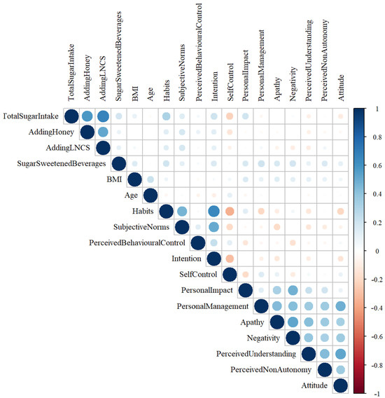The relationships between consumers’ attitudes and preferences toward sugar intake and BMI, age, sugar intake, honey intake, low- or no-calorie-sweetener intake, total energy from beverages, and total scores are shown in Figure 3. A moderate positive relationship between sugar intake and habits (r = 0.336; p < 0.001); a weak positive relationship between sugar intake and subjective norms (r = 0.114; p < 0.001), intention (r = 0.278; p < 0.00), and personal impact (r = 0.196; p < 0.001); and a weak negative relationship between sugar intake and self-control (r = −0.216; p <0.001), perceived understanding (r = −0.082; p = 0.012), and attitude (r = −0.145; p < 0.001) were observed (Figure 4).