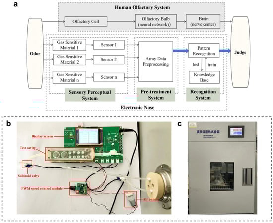 Electronic nose monitoring system. (a) General description of the human olfactory system and how it works with an electronic nose. (b) Electronic Nose development platform. (c) Thermostatic chamber.