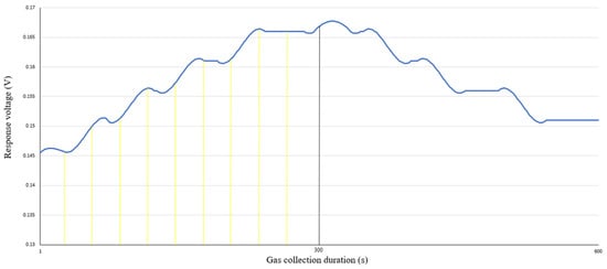 The monitoring of the electronic nose for oysters was conducted as follows: After preheating the electronic nose for one week, it was connected to the incubator (as illustrated in Figure 1c). Subsequently, oyster samples were placed into the incubators at the designated temperature before activating the air current control for continuous regular monitoring. Simultaneously, the upper computer was turned on to initiate data collection. Each monitoring period included a thorough cleaning lasting 10 min, followed by five data collection sessions. Both the data collection and short cleaning processes lasted 5 min, with a sampling frequency of 1 Hz. The access and cleaning loop for each individual sample were managed by the gas selection module on the testing equipment.