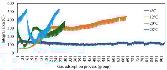 In summary, the entire adsorption process was analyzed by calculating the integral area for oyster samples grouped in 5 min intervals. The integral areas of S1 at four different temperatures were aggregated and plotted as a line graph in Figure 3. It is evident that the change in integral area in response to the S1 sensor for oysters at 4 °C is not significant. However, as the temperature increases, the changes in integral area become more pronounced, although this does not facilitate direct analysis. A review of the literature suggests that the rate of volatile gas evaporation in oysters does not necessarily increase consistently with temperature variations. Consequently, the initial processing of the raw response signals does not provide a direct means for assessing oyster freshness.