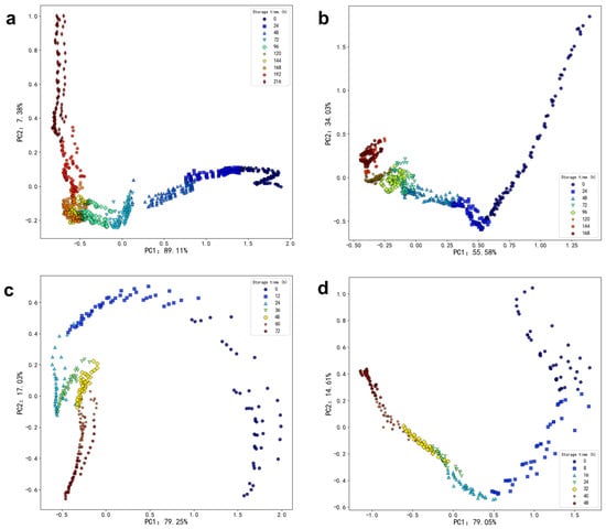 Visualization of PCA algorithm for feature extraction of oyster samples. (a) Gas samples from oysters in an environment of 4 °C. (b) Gas samples of oysters in an environment of 12 °C. (c) Gas samples of oysters in an environment of 20 °C. (d) Gas samples of oysters in an environment of 28 °C.