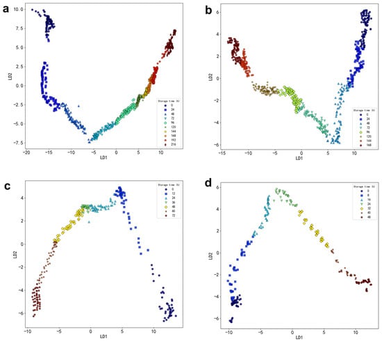 Visualization of LDA algorithm for feature extraction of oyster samples. (a) Gas samples from oysters in a 4 °C environment. (b) Gas samples from oysters in a 12 °C environment. (c) Gas samples from oysters in a 20 °C environment. (d) Gas samples of oysters in an environment of 28 °C.