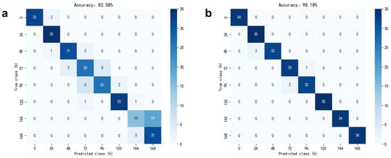 The SVM model, constructed using a dataset processed by the Principal Component Analysis (PCA) algorithm at a temperature of 12 °C, is illustrated in Figure 6a to predict the storage duration of oysters. This model demonstrates a classification accuracy exceeding 80%, indicating robust performance. However, there are several misclassified samples at storage durations of 72, 96 and 144 h, attributed to considerable overlap in sample points, as shown in Figure 4b.