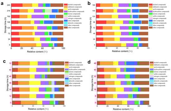 Relative contents of various volatile substances: (a) 4 °C, (b) 12 °C, (c) 20 °C, (d) 28 °C.